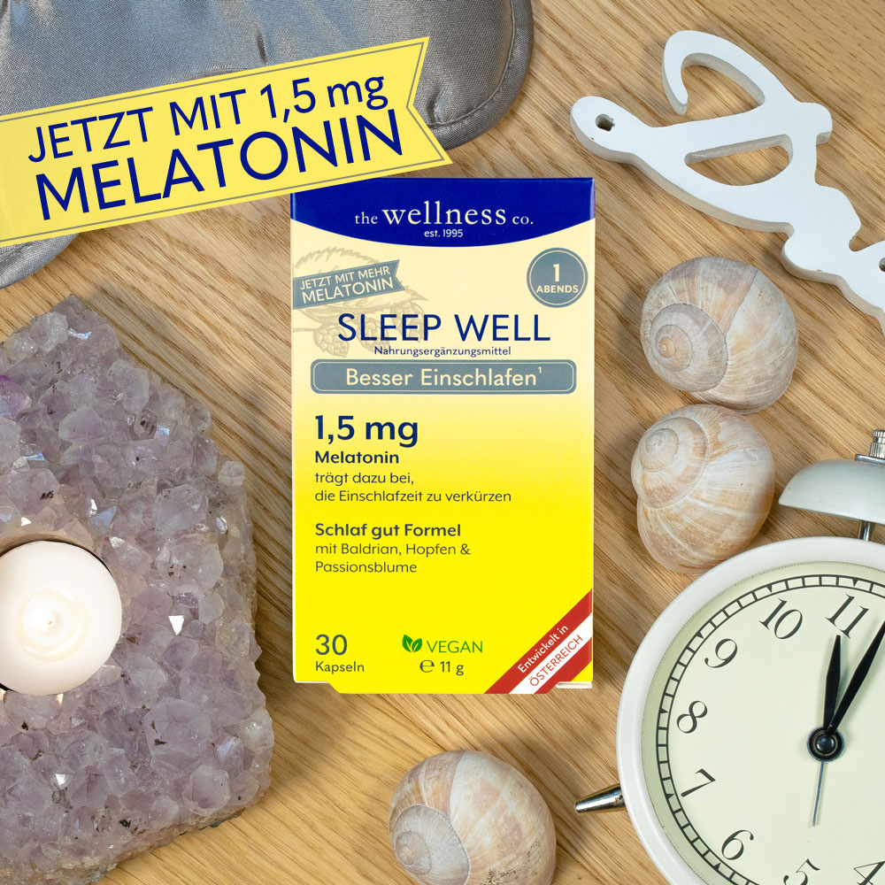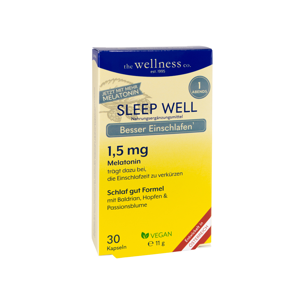 SLEEP WELL ist eine besondere Kombination von vier natürlichen Bestandteilen. Melatonin, eine körpereigene Substanz, steuert den Tag-Nacht-Rhythmus unseres Organismus und trägt dazu bei, die Einschlafzeit zu verkürzen. Die pflanzlichen Extrakte aus Baldrian, Hopfen und Passionsblume werden seit alters her bei Nervosität, Unruhe und Anspannung angewandt und unterstützen einen ruhigen und entspannten Schlaf.